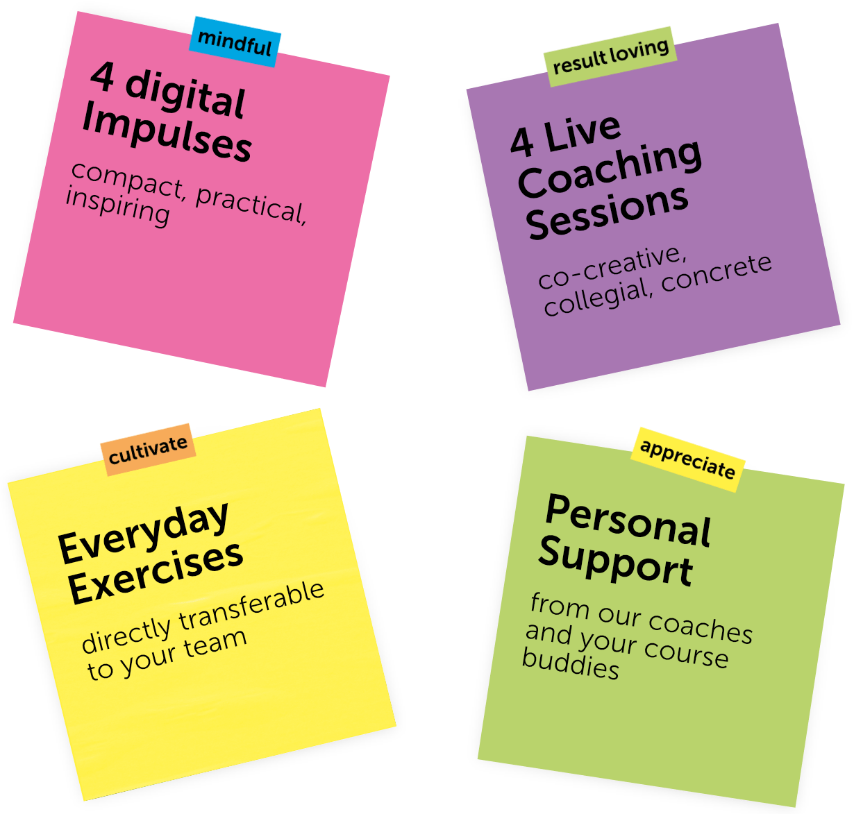 We focus on practical exercises and reflection phases: You work with real challenges from your day-to-day management work and bring what you have learned directly into the team. You will also be accompanied by a coach and a course buddy – they will support you in sticking with it and applying it.