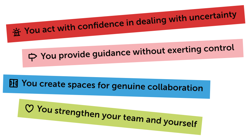 We create spaces where you can develop further as a leader. Through exchange, by experimenting, while applying what you learn.